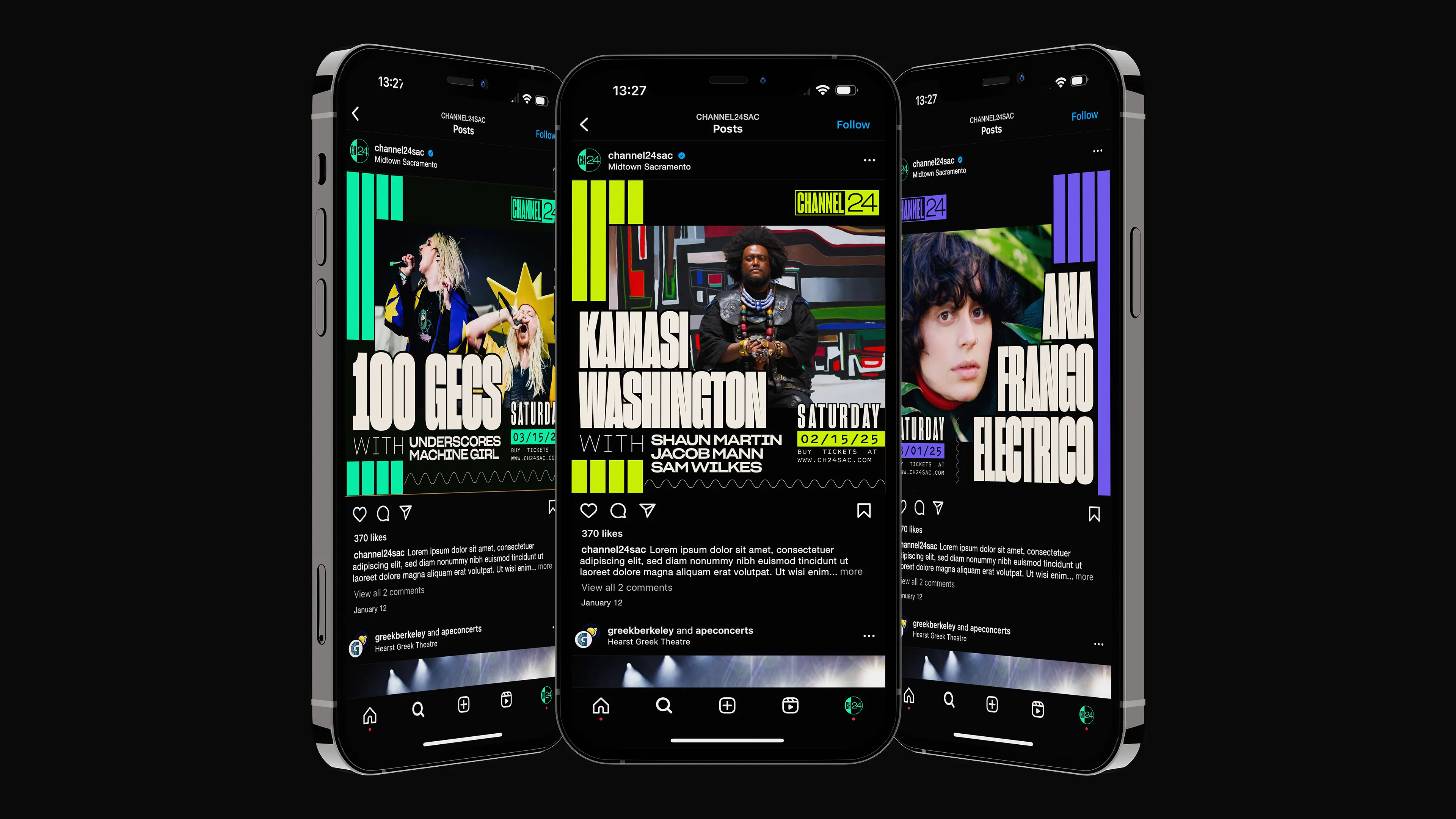 Our designers got to fast-tracking three visual brand systems for the client to pick from. The chosen brand, a mix of classic and refined, sophisticatedly nods to the colors, text, and displays from audio equipment. Lead designer Brady Comerford used an adaptable superfamily font for her text-forward brand system. It's supported by a typeface resembling the engraved labels on a mixing board. A VFD screen's luminescent colors and black background inspired the color system. For the logo design, Brady referenced APE venues like The Independent, The Greek Theatre, and the Bill Graham Civic Auditorium. Its uncomplicated functionality has the look of old stereo labels and cassette packaging.
