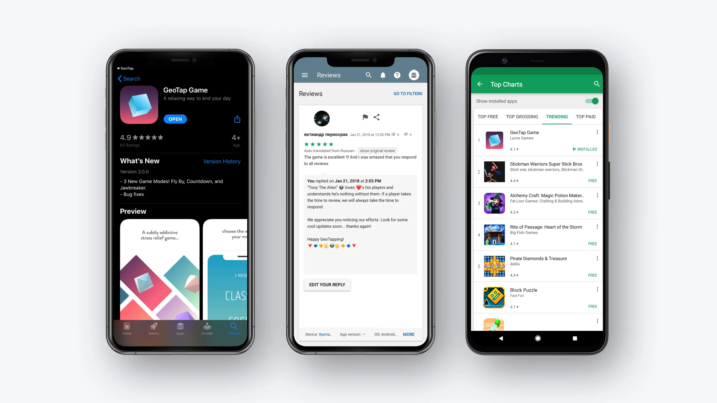 After a positive initial response, we added features requested by the crowd—unlockable content with a virtual currency system, additional game modes, and an updated UI. This new version was quickly featured both in the Google Play Indie Corner and on the Google Play game listing, where it became the #1 trending game in the Casual category.