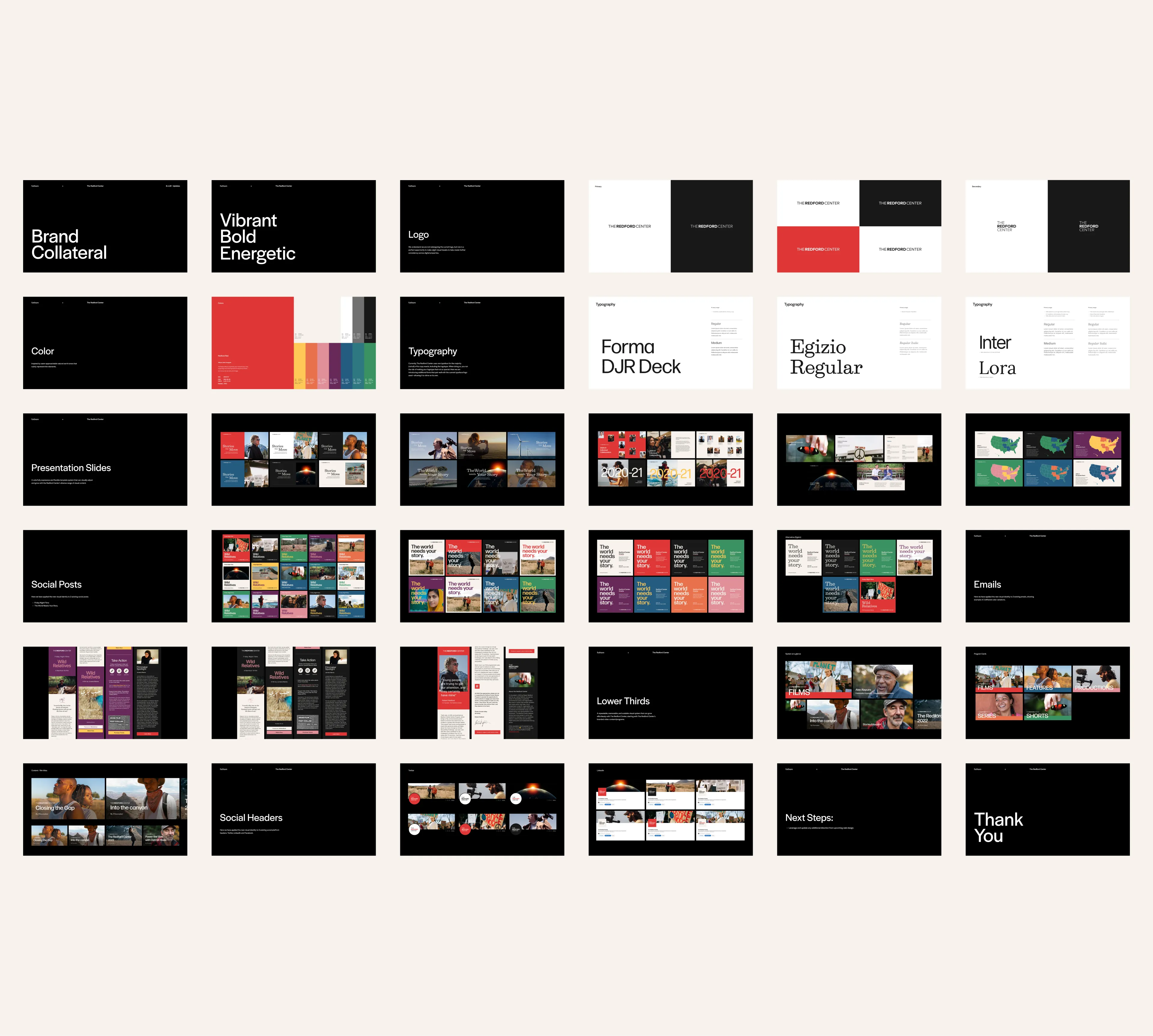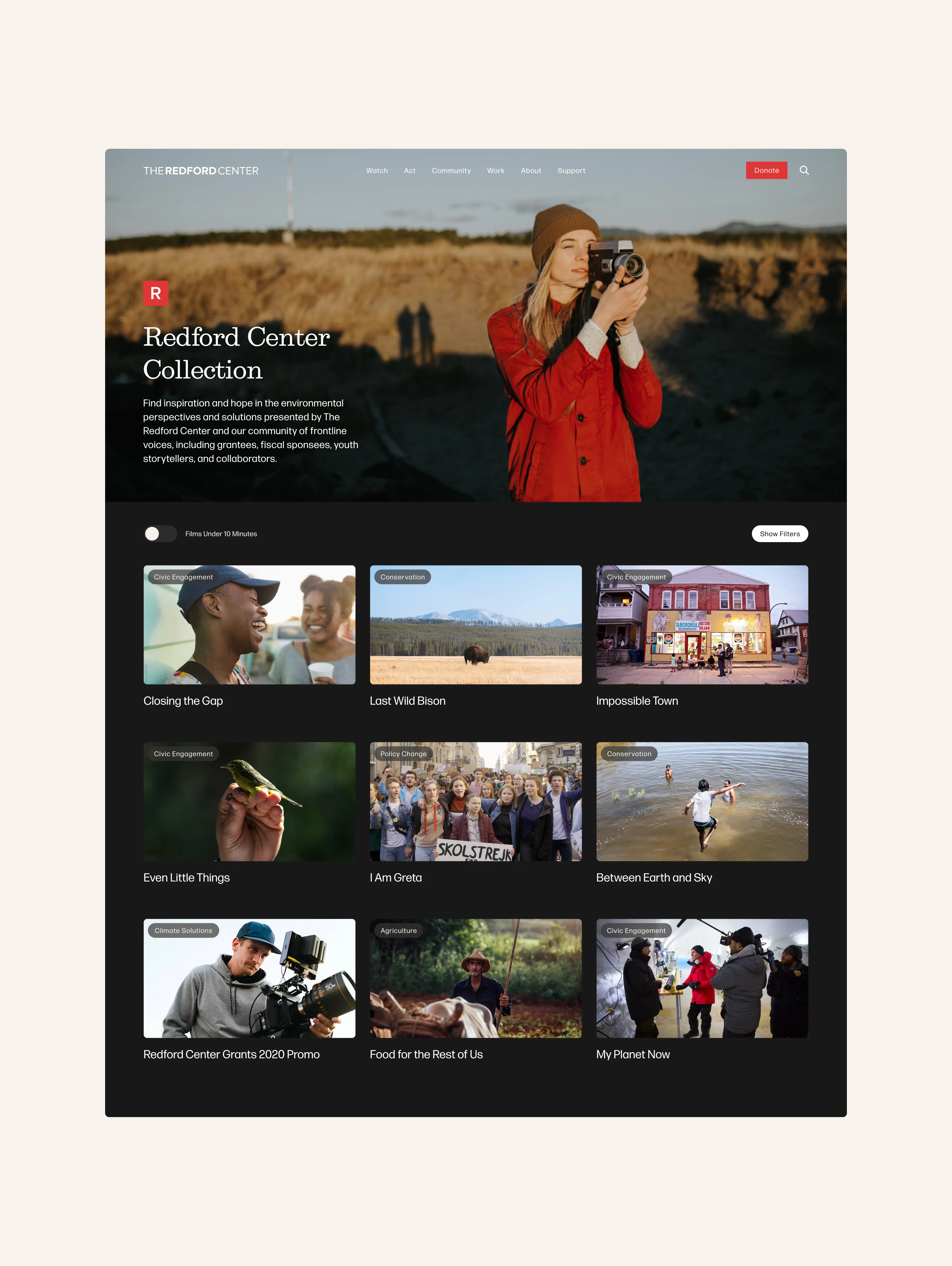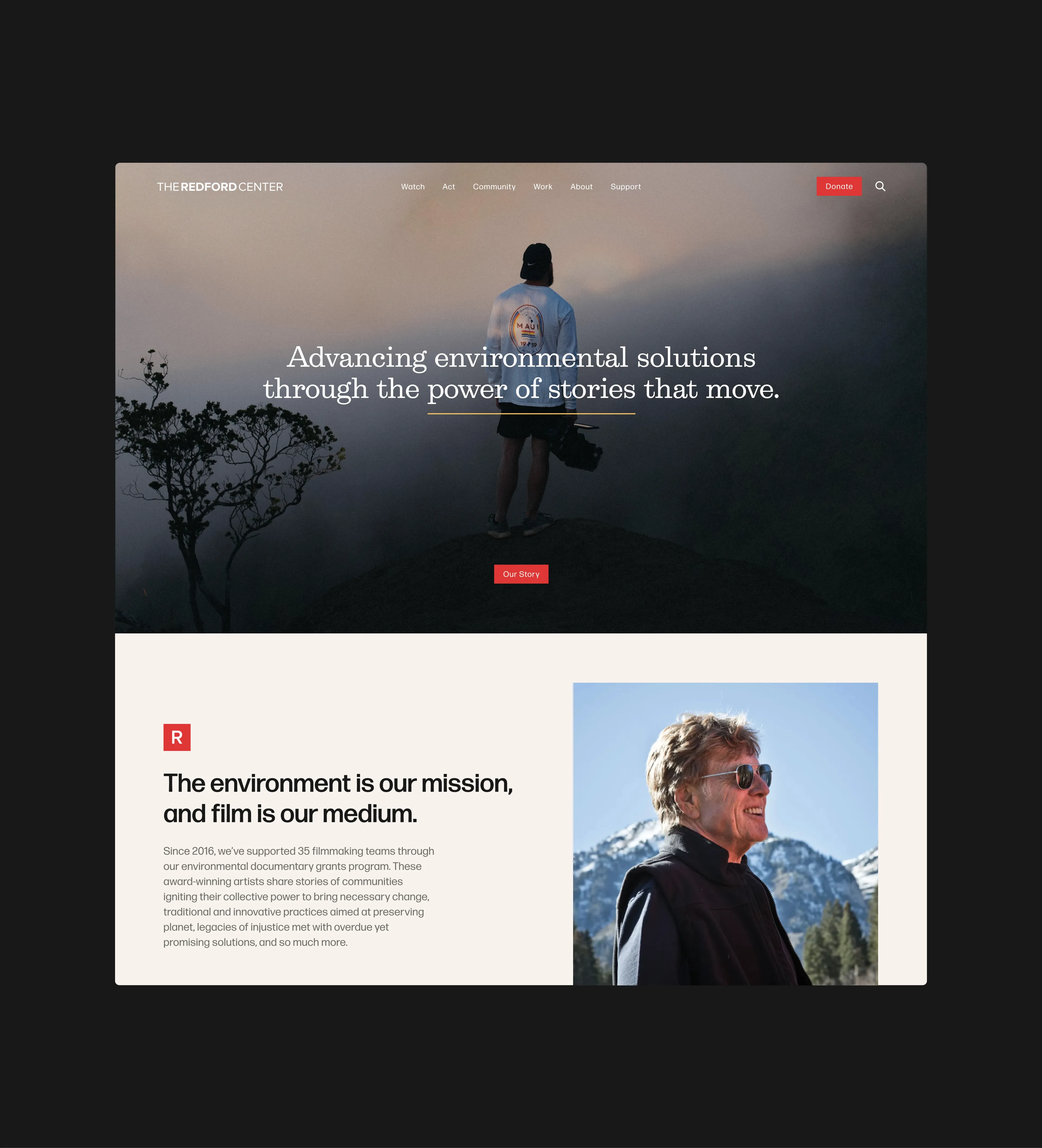 The Redford Center has been a major producer and proponent of environmental storytelling for over 15 years. They looked to us to rejuvenate their identity and ensure it could easily keep stride with them into the future. The resulting brand system matches their co-founders' elegant and classic sensibility. It centers on their massive catalog of films, which are marketed in bold frames of natural colors influenced by soil, air, water, and foliage.