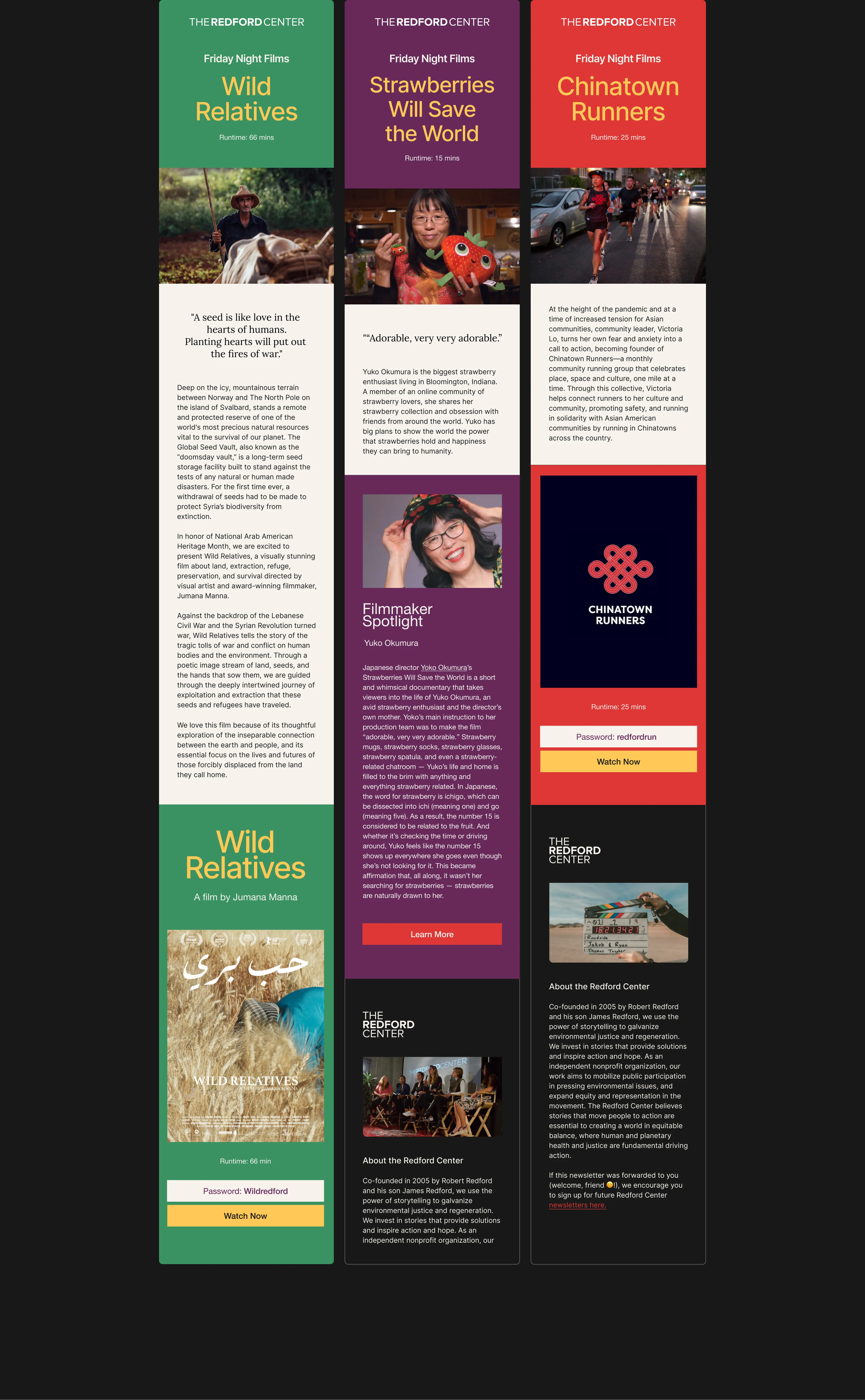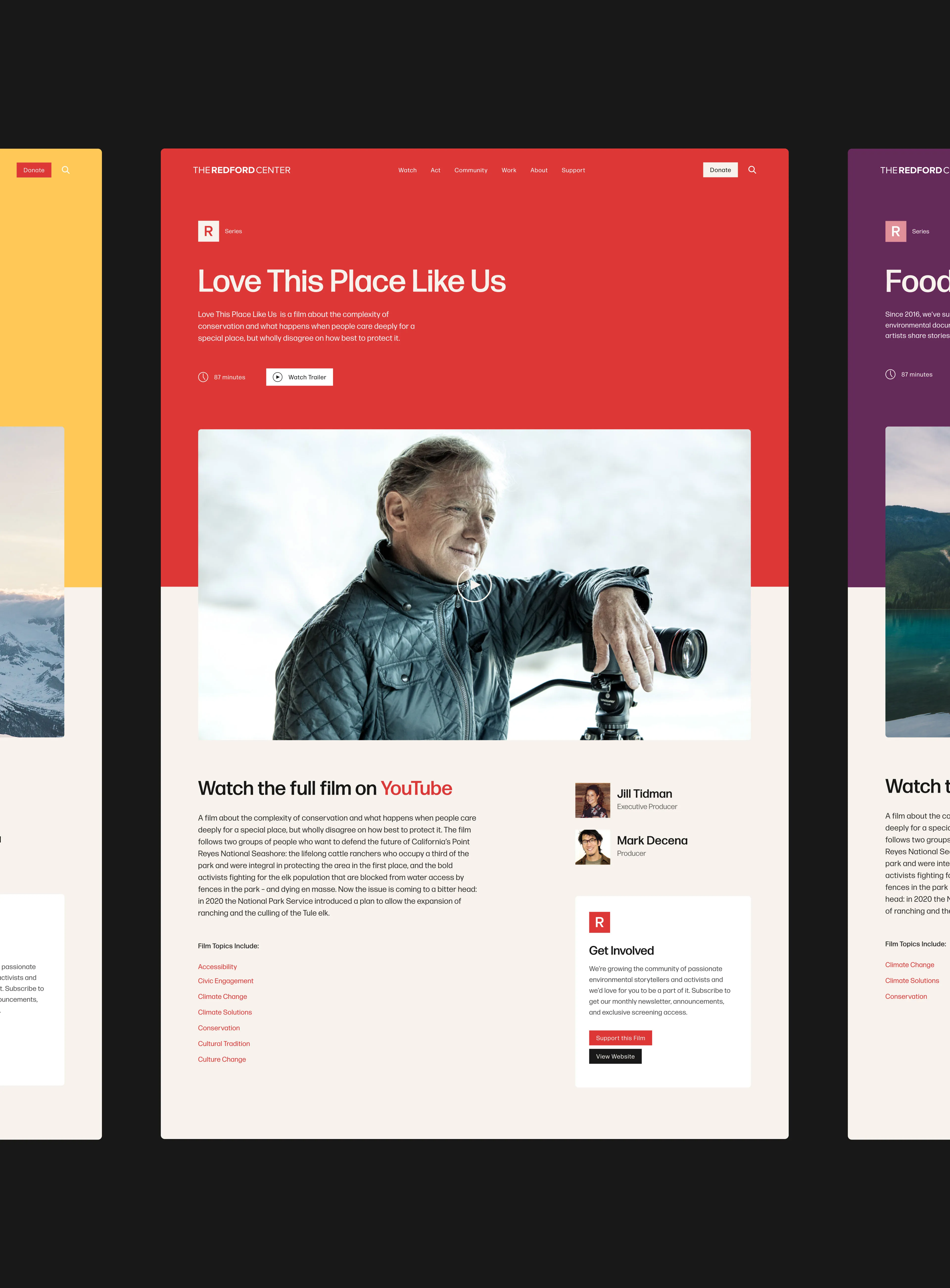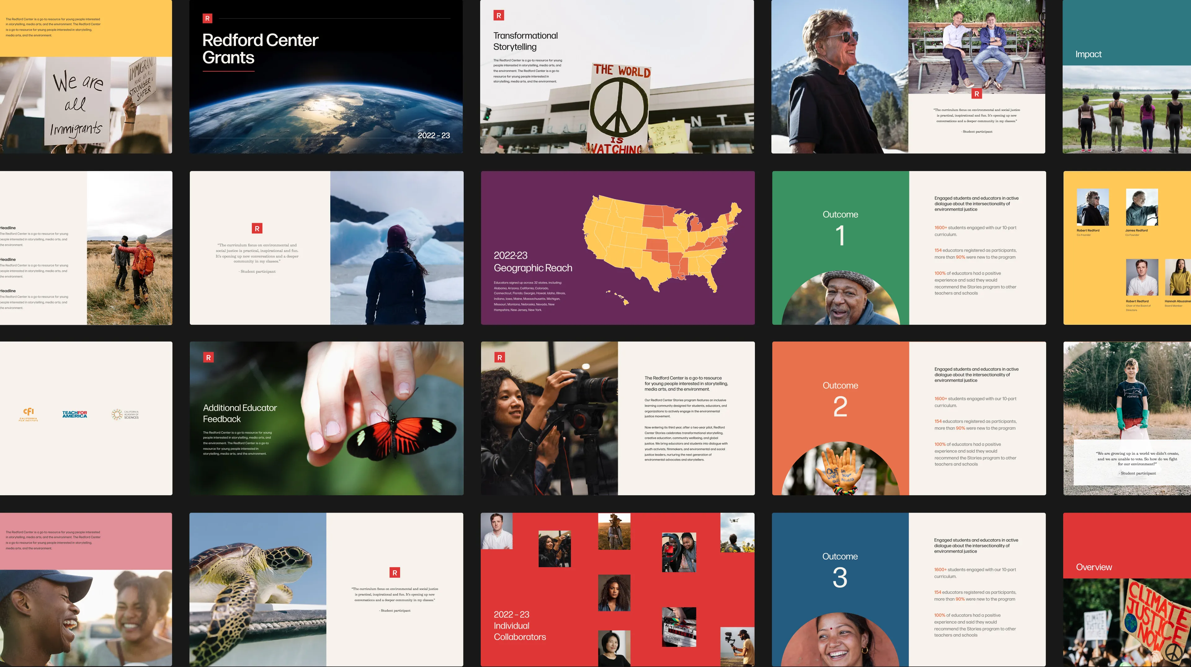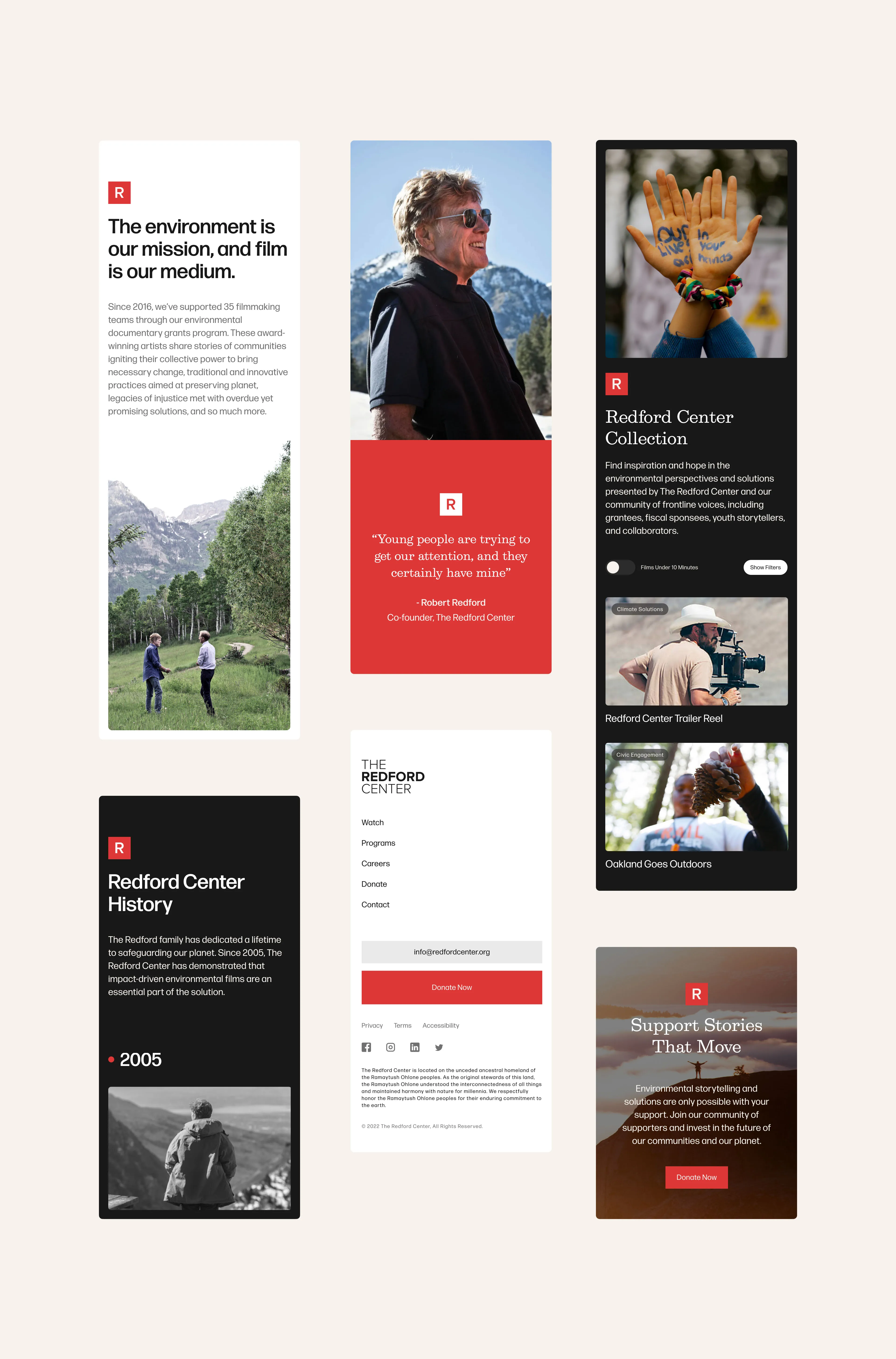The Redford Center has been a major producer and proponent of environmental storytelling for over 15 years. They looked to us to rejuvenate their identity and ensure it could easily keep stride with them into the future. The resulting brand system matches their co-founders' elegant and classic sensibility. It centers on their massive catalog of films, which are marketed in bold frames of natural colors influenced by soil, air, water, and foliage.
